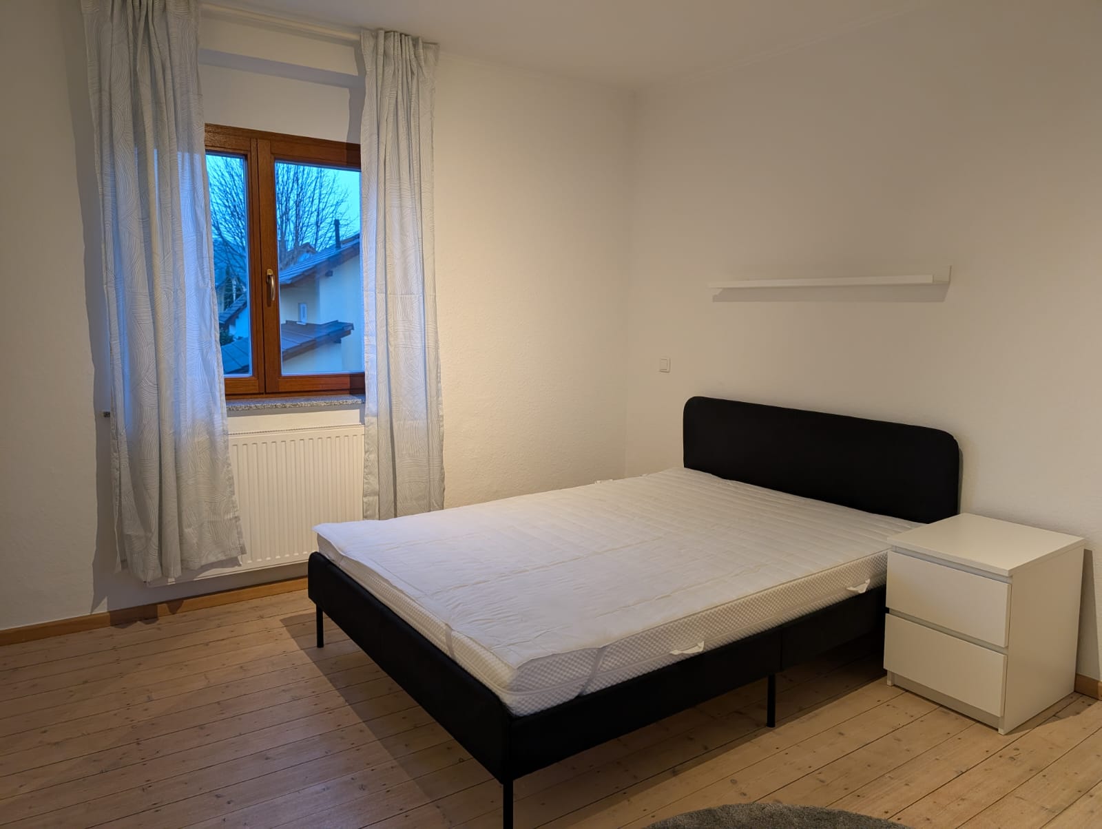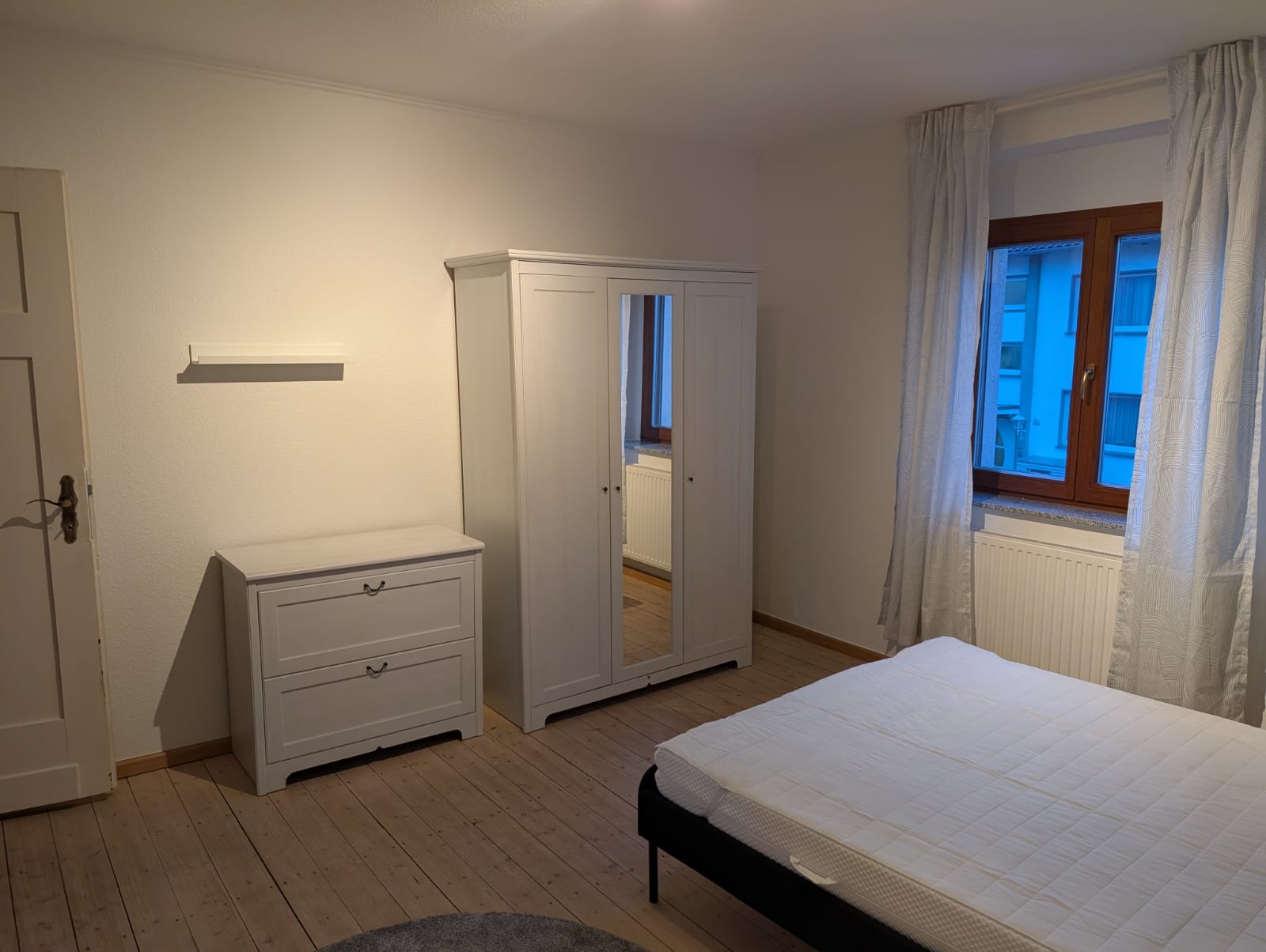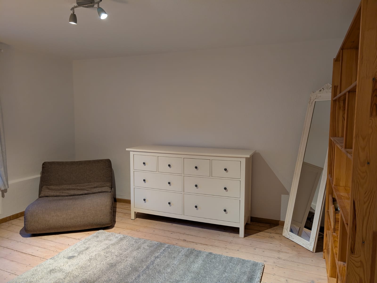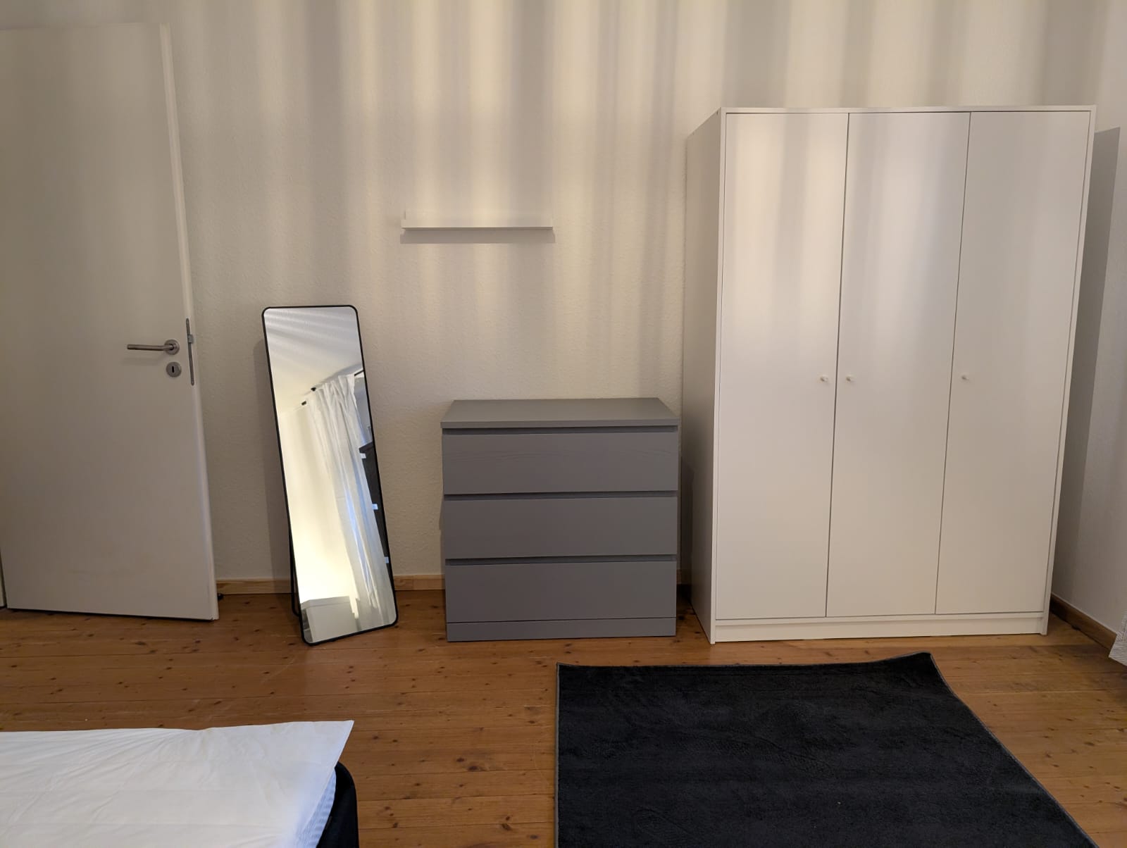 - Möblierung Schlafzimmer: Bett (70-140 x 200 m) inklusive Matratze und Hygiene-Topper, Kleiderschrank, Regal, Kommode, Spiegel, Gardinen, Teppich