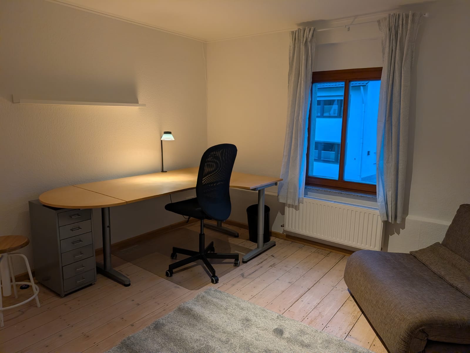 - Möblierung Durchgangszimmer: Schreibtisch mit Rollcontainer und Stuhl, Regal, Kommode, Sofa, Gardinen, Teppich