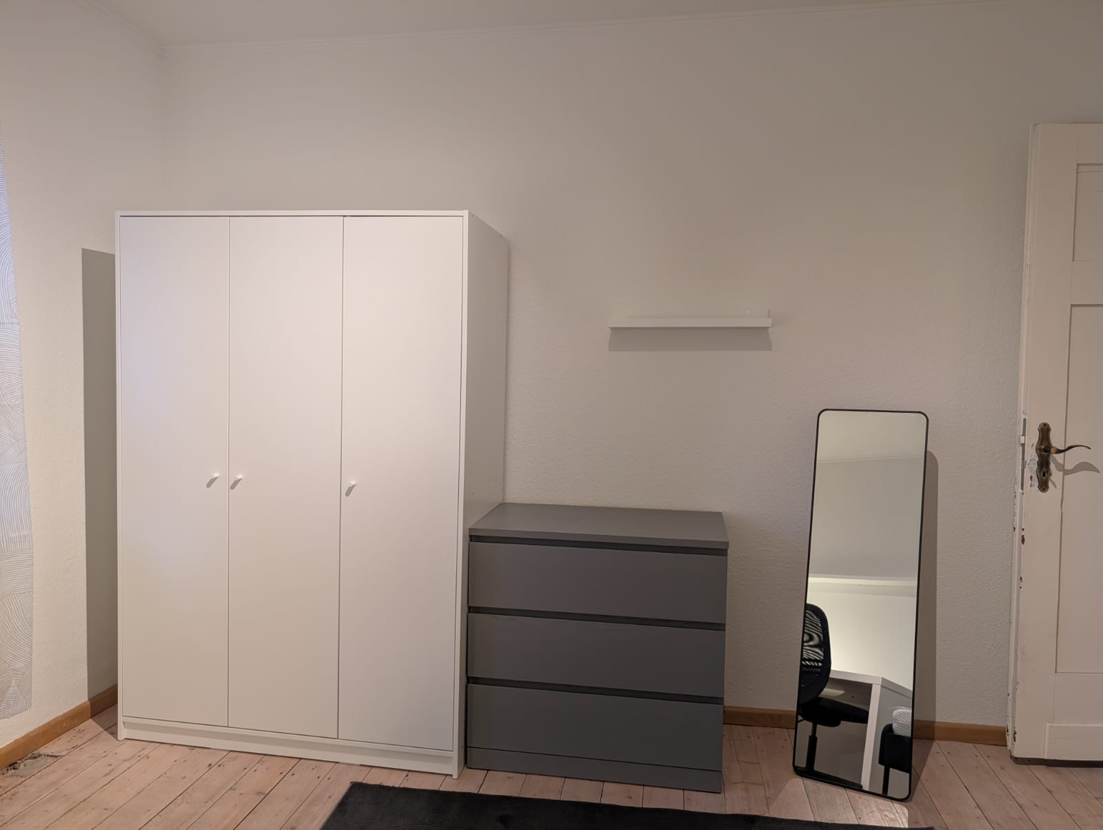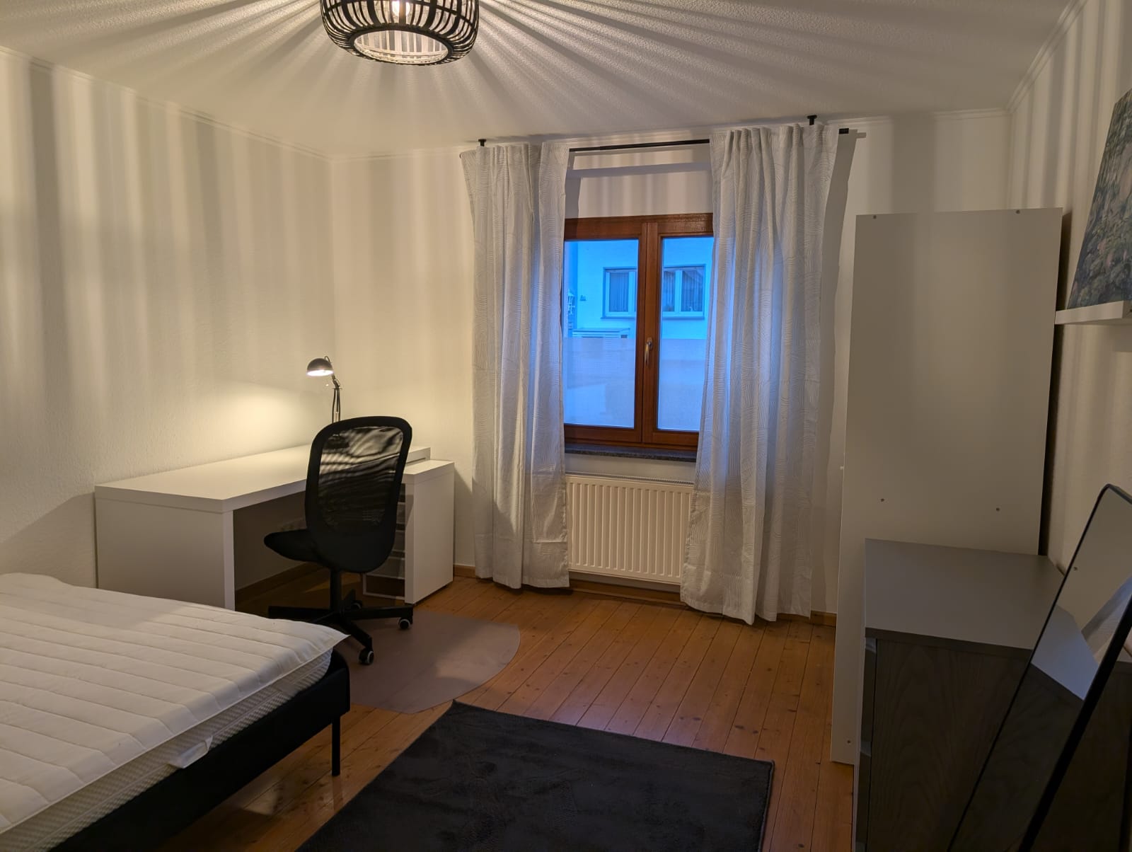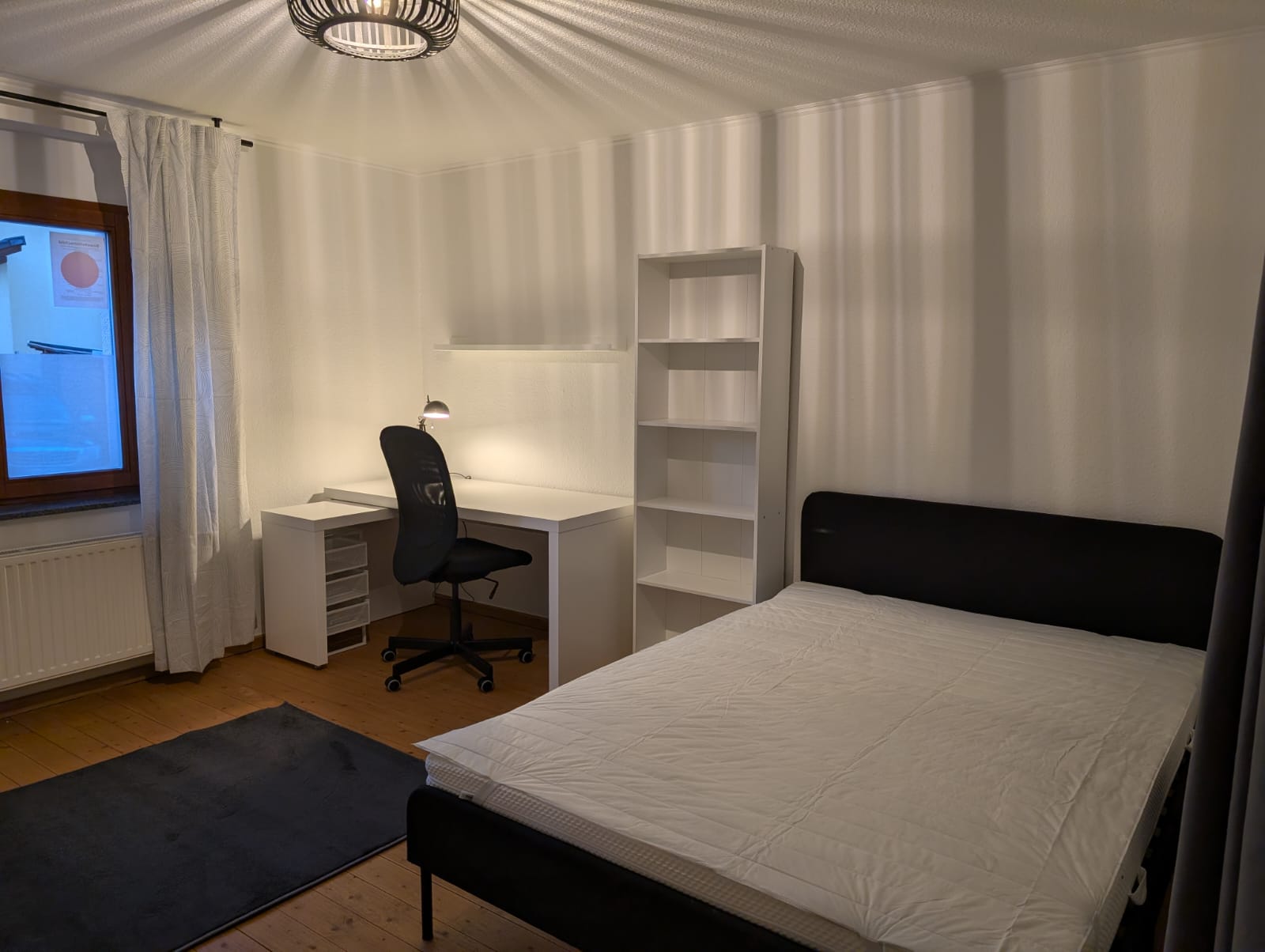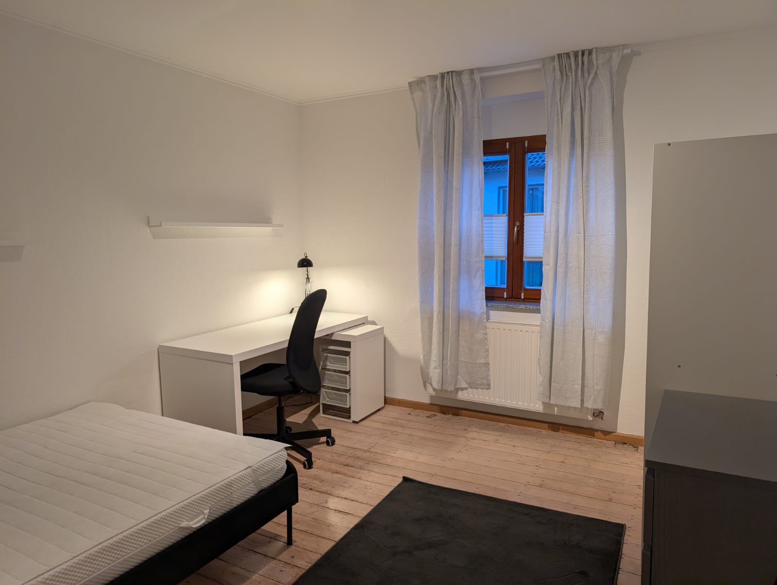 - voll möbliert mit: Bett (70-140 x 200 m) inklusive Matratze und Hygiene-Topper, Schreibtisch mit Rollcontainer und Stuhl, Kleiderschrank, Regal, Kommode, Spiegel, Gardinen, Teppich